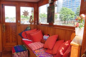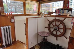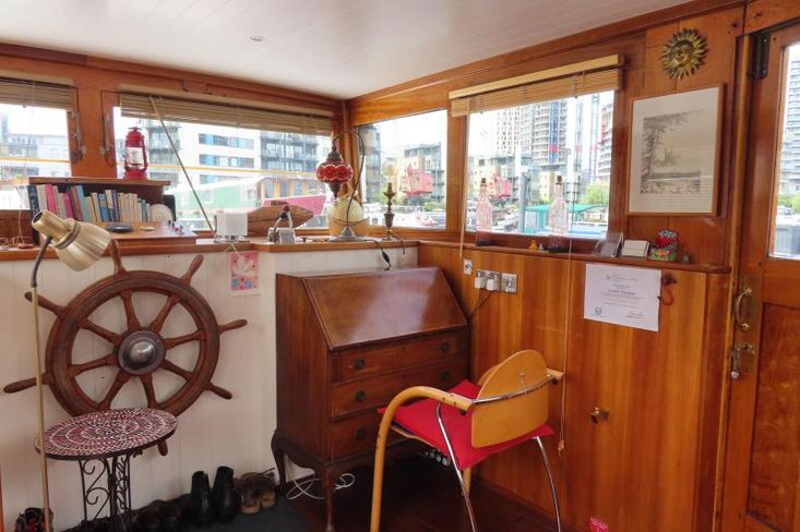 A beautiful small office space, with view over the marina and Canary Wharf. Sapele floor, original wheel, and controls for piloting Elsie May. Custom upholstered bench with matching cushions.