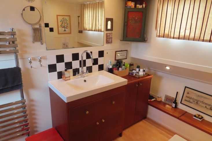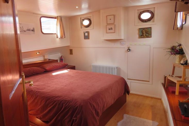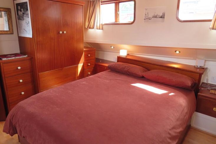 King-size bed with hydraulic lift-up mechanism for under-bed storage. Additional storage in bedhead. Bespoke fitted cabinetry, sapele wood. Slide-out bedside table shelves. Two traditional brass portholes, which allow for a flow of cooling air down the length of the boat even on the hottest day.