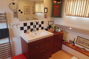 Full-size bath, large basin, plenty of cupboard and drawer storage for towels and products. Macerating toilet. “Invisaline” shower curtain — completely hidden when not in use.